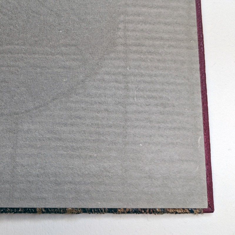 Nach Waschen und Ausflicken, besonders am Falz, als Deckenband in Leder und hand-gedrucktem Stoff aus Venedig eingebunden. Sieht aus wie ein Dänischer Millimetereinband, ist es aber nicht weil nicht auf tiefen Falz und als Deckenband ausgeführt. Titel in schwarz gestempelt mit Zierlinien.