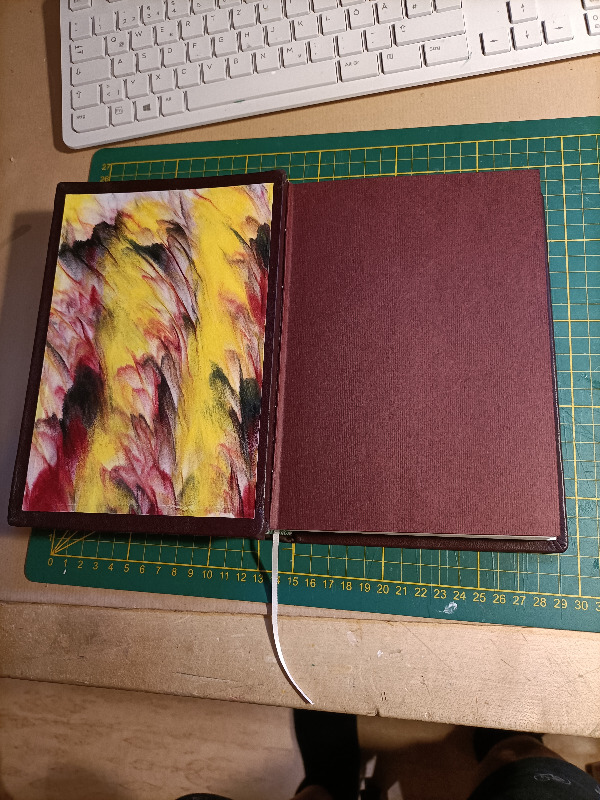 Danke. Und auch für den Tipp. Über das Cover bin ich mit Acrylklarlack drüber, das wäre sicher auch mit dem Bienenwachs gegangen, aber ich hatte auch Aquarell dabei, da wollte ich auf nr. Sicher gehen. Bei den Innenseiten habe ich mit Kleister gearbeitet. Blöd, weil durch den Kleister der Kleister wieder aufweichte. Da hätt ich einfach ein n wenig Druck drauf machen sollen und warten.