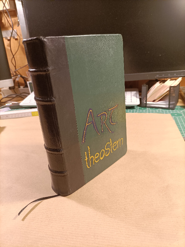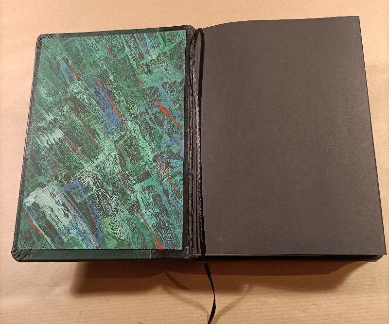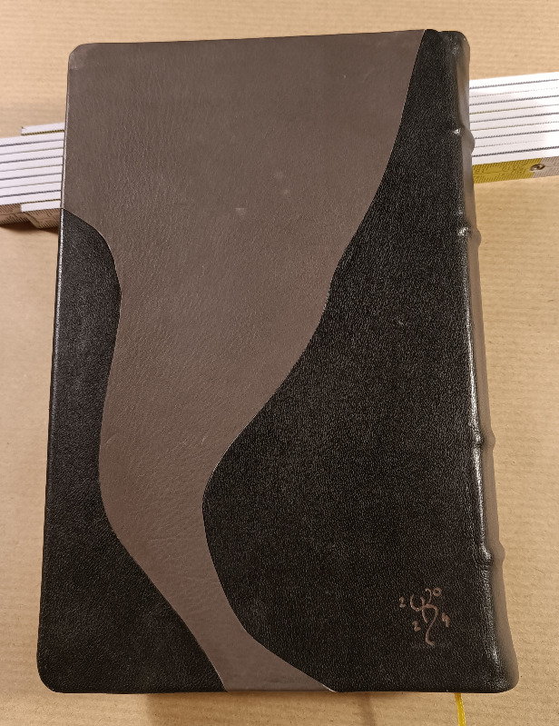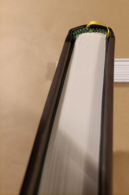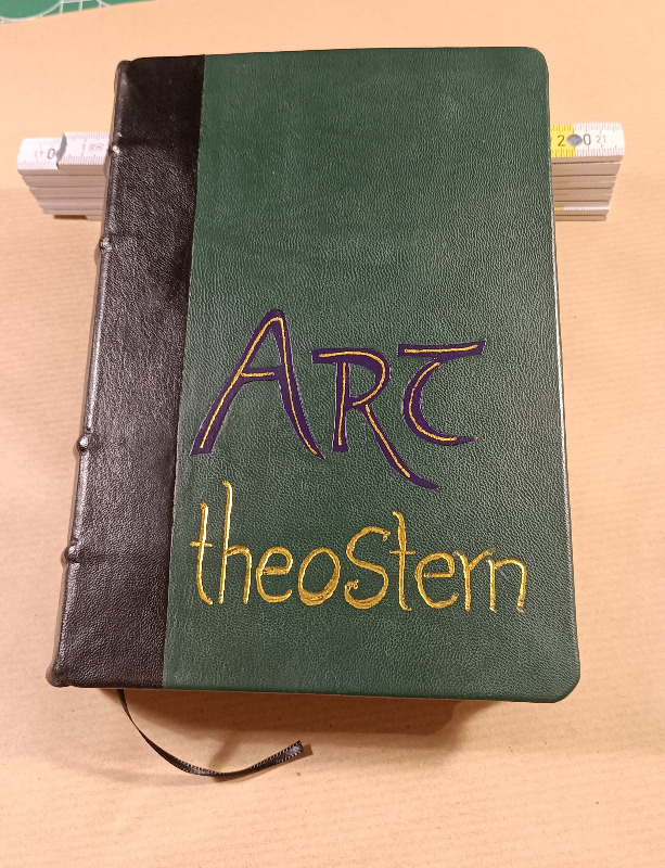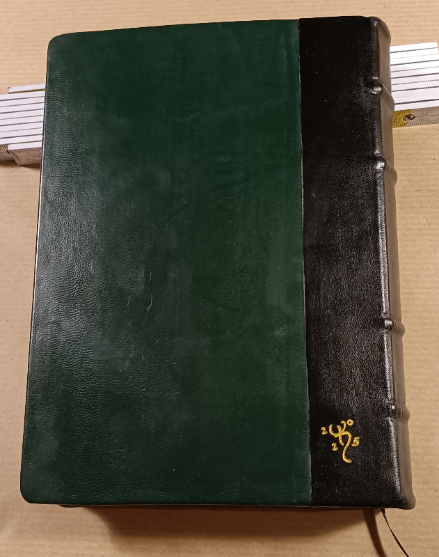 Art ist am Rücken mit dem schwarzen Lammleder bestückt und die Decken mit einem Stück "Problemleder". Ziege, das Grün hat mir gut gefallen, aber es färbte ab, wenn man leicht feuchte Finger hatte. Jetzt habe ich das Ding mit einem PU Klarlack überstrichen und hoffe, dass das hält. Was auf Parkett hält, sollte auch auf Leder halten.