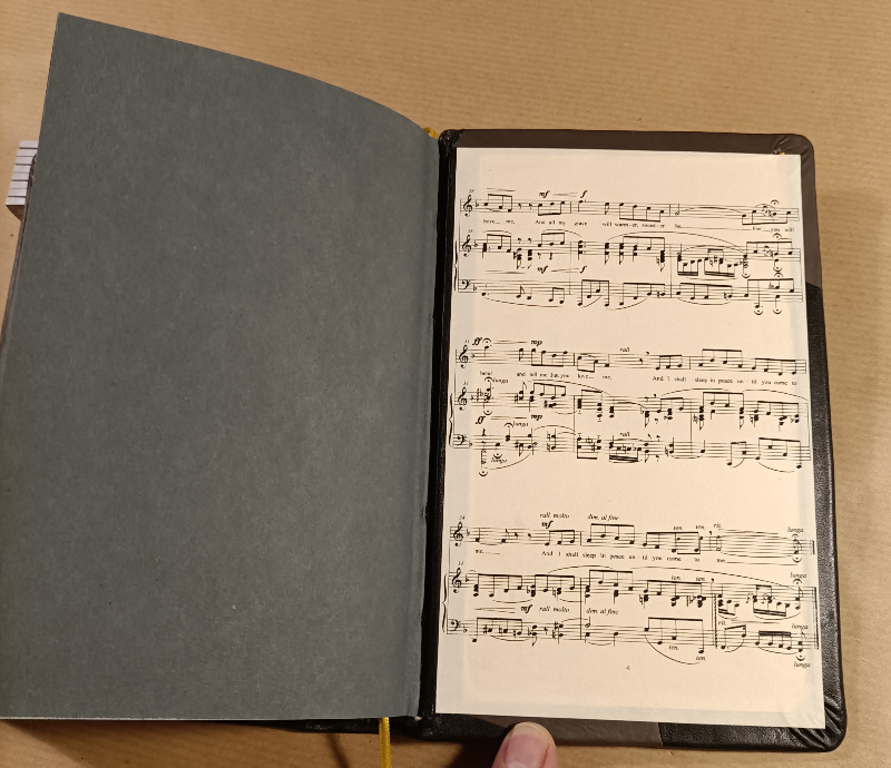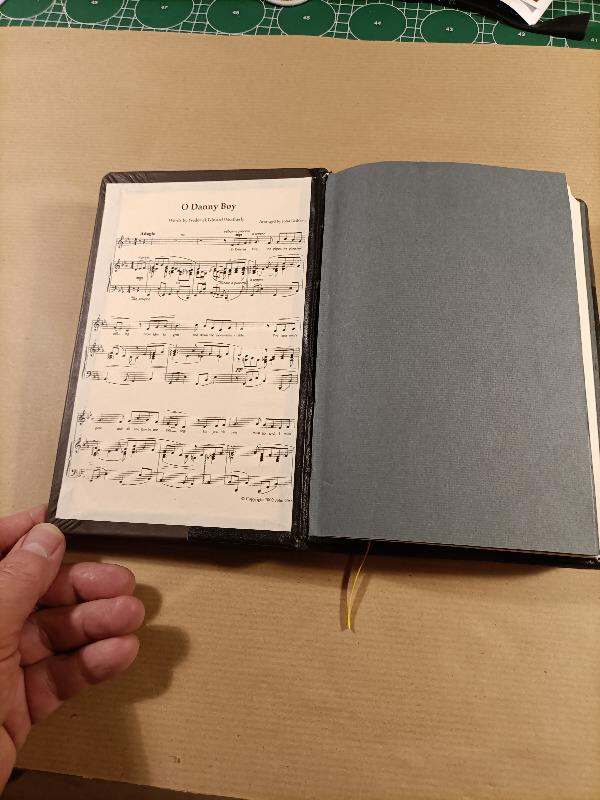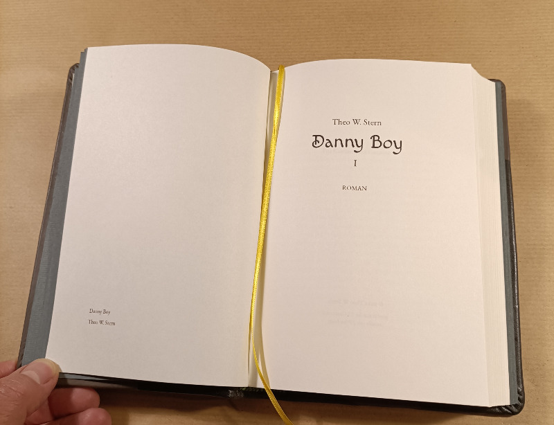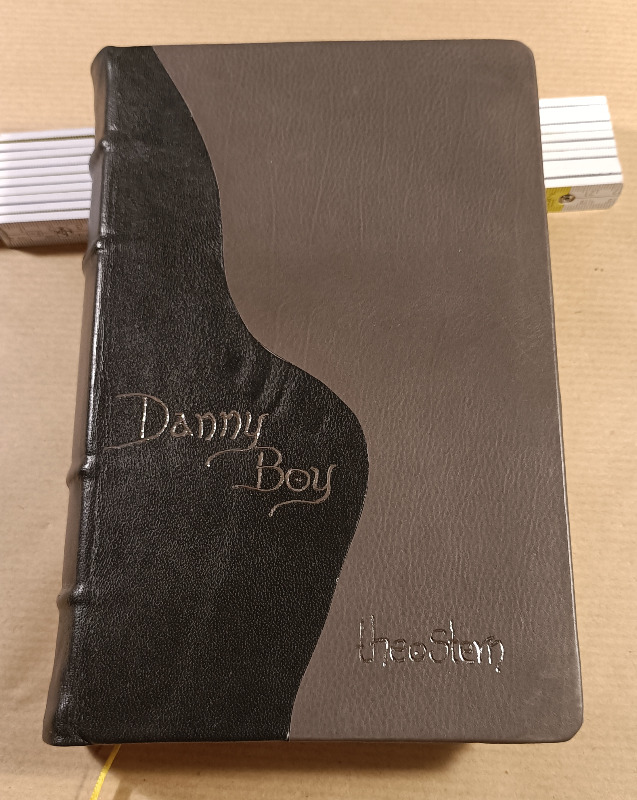 Danny Boy ist gebunden in Lammleder, einem Stück aus einem nicht mehr getragenen Mantel der Tante meiner Frau, bestimmt schon Jahrzehnte alt und einem Stück grauen Leder, vermute, das ist auch Lamm oder eine weiche Ziege.