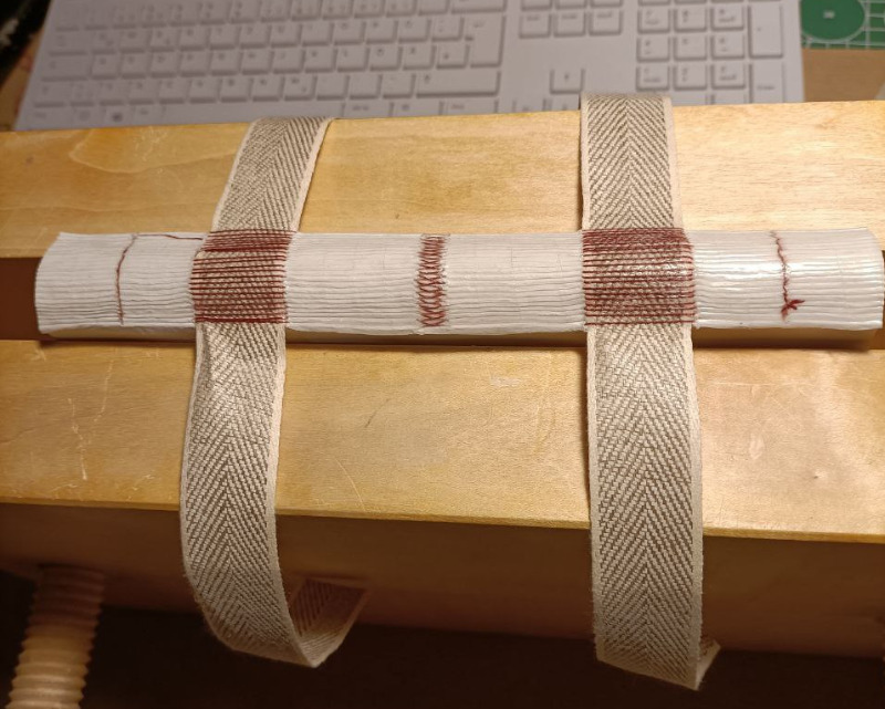 Egal. Hab das kaschiert, zwischen die Bänder Ausgleichspapier geklebt und drüber Gaze.