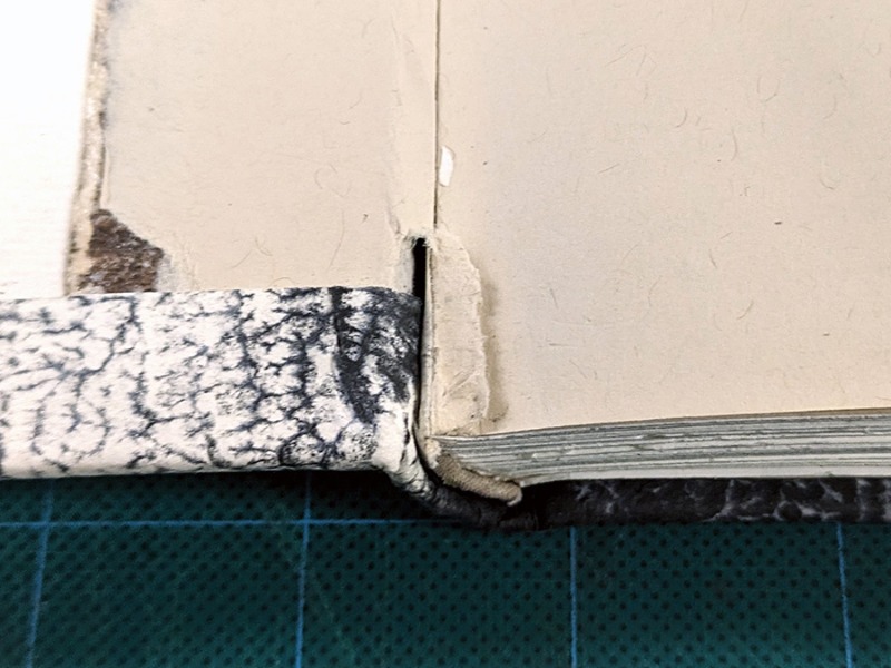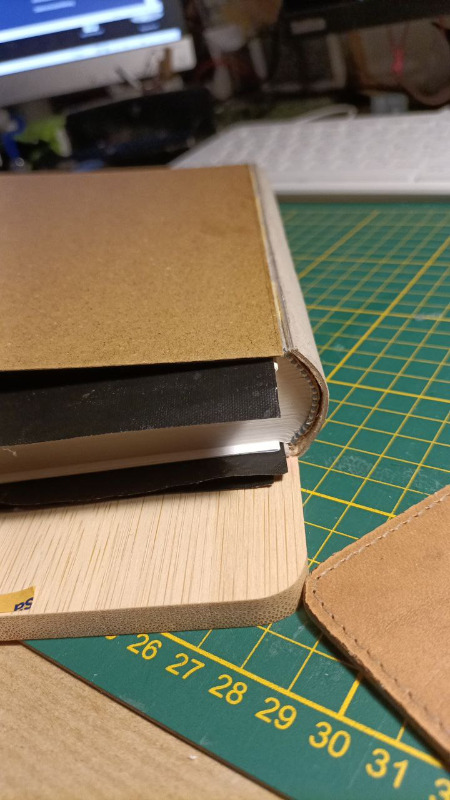 2. Der Falzabstand zwischen Rückeneinlage und Deckel erscheint mir sehr schmal so dass es sperren könnte beim Öffnen. Bei so einem Einband benutze ich gewöhnlich zwischen 5-7 mm je nach Überzugsmaterial.