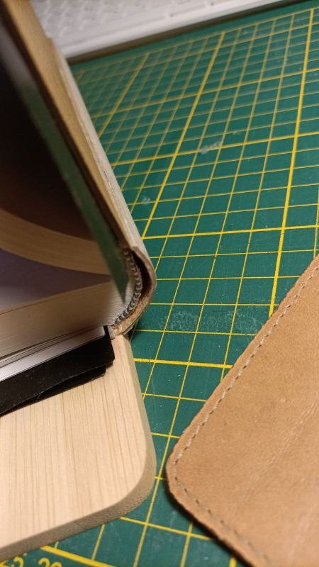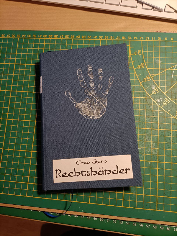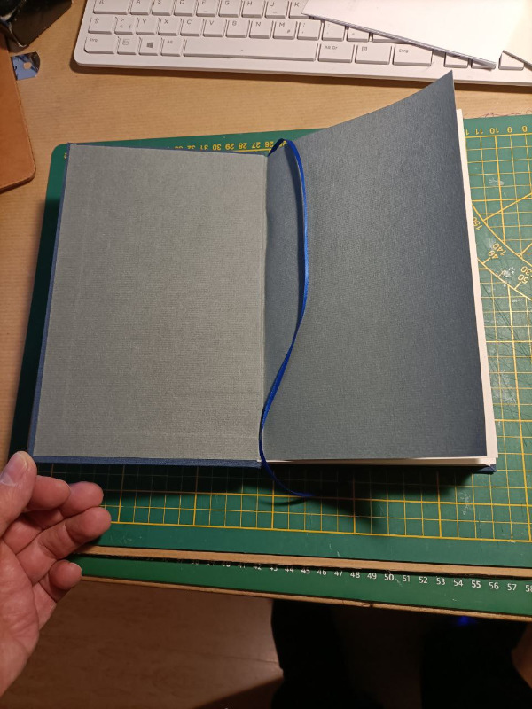 Nun, es hat dann doch noch funktioniert, nachdem ich den Bezug noch mal abgemacht hatte. Es lässt sich wie erwartet nicht so gut aufschlagen, aber das liegt auch ein gut Teil daran, dass das Papier die falsche Laufrichtung hat.