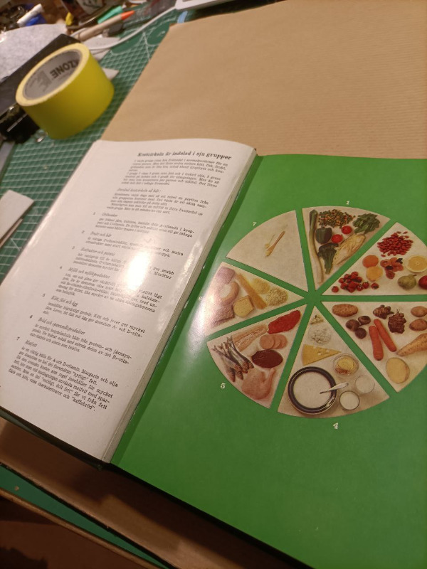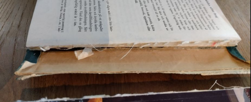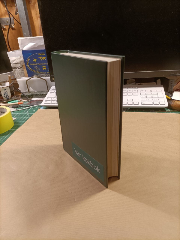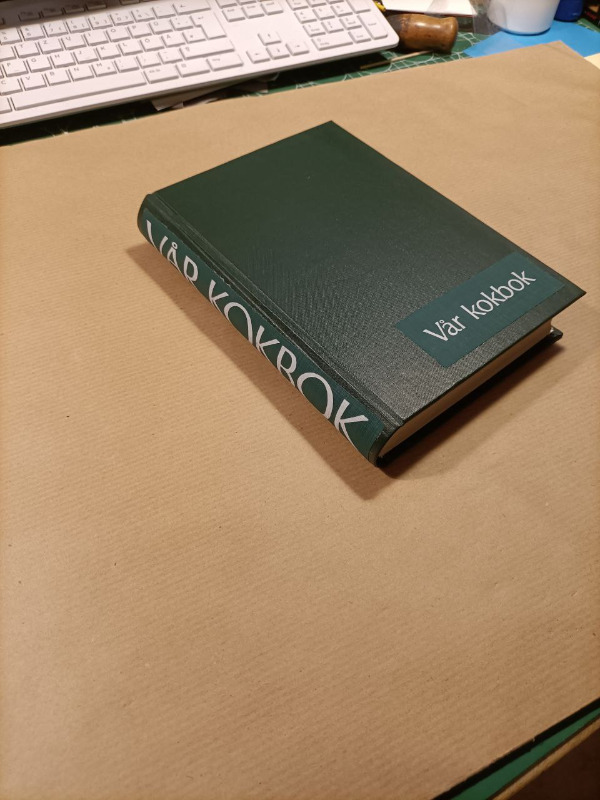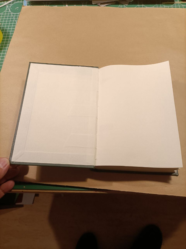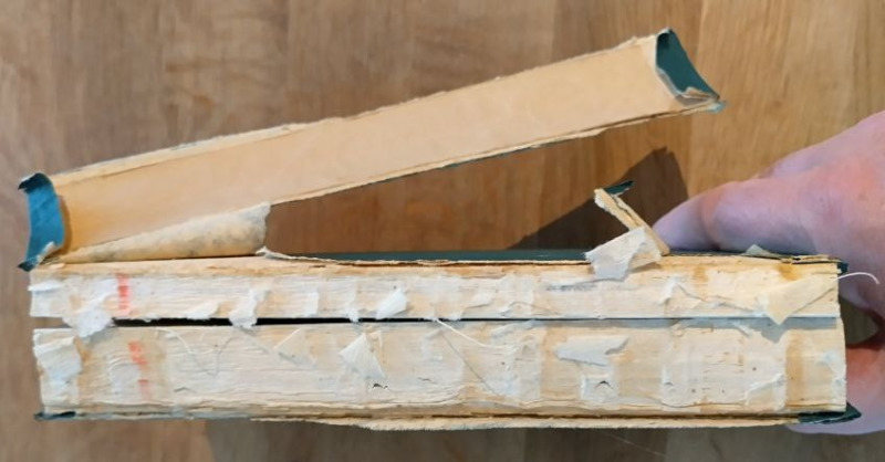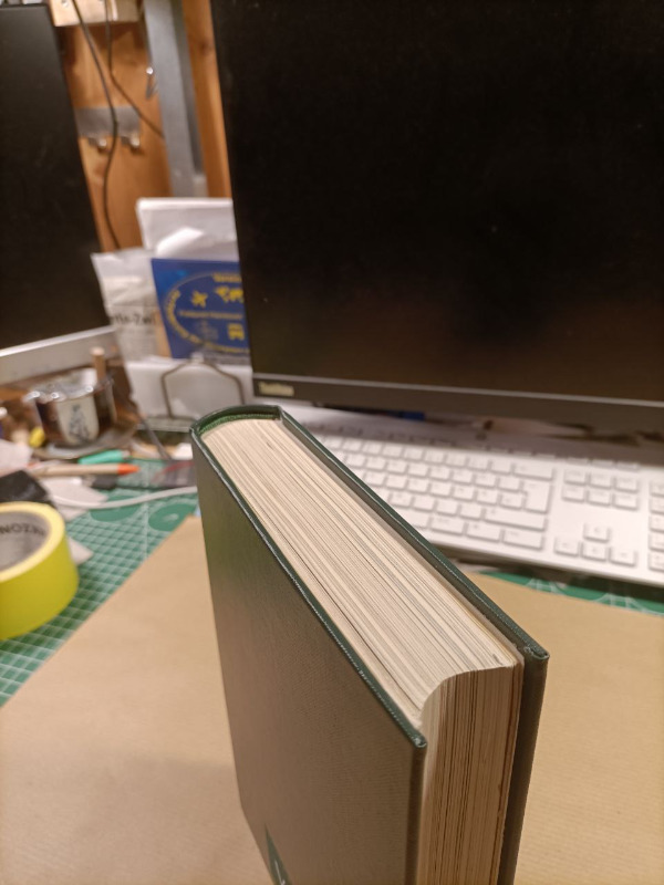Die Schrift konnte ich retten und das Grün passt auch nicht schlecht zu dem vom neuen Einband. Nur mit Planatol BB hielt das nicht. Hab dann einen anderen Alleskleber probiert, das hielt dann. Ist schwierig zu trocknen.