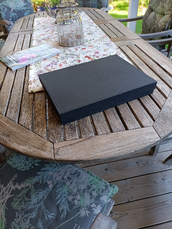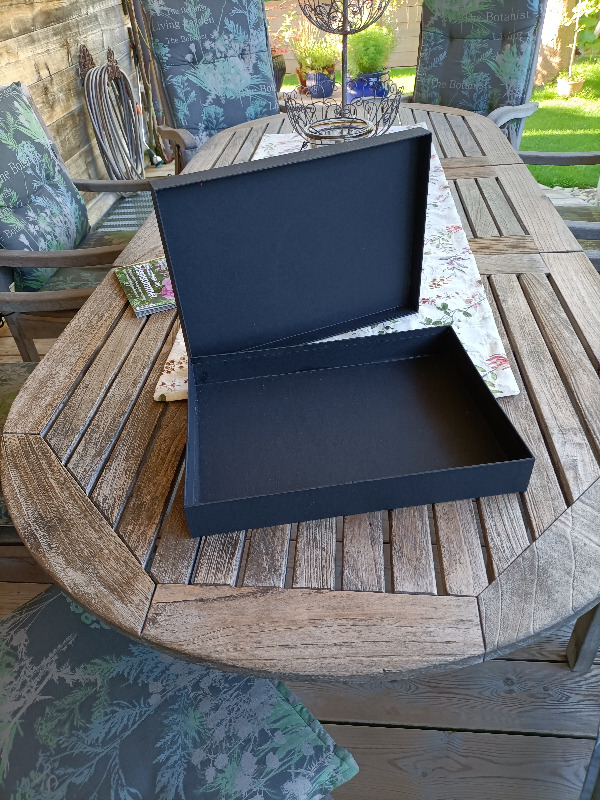 Es ist eine Schachtel und ich hätte für den Überzug mit dem schwarzen Papier besser Kleister genommen.