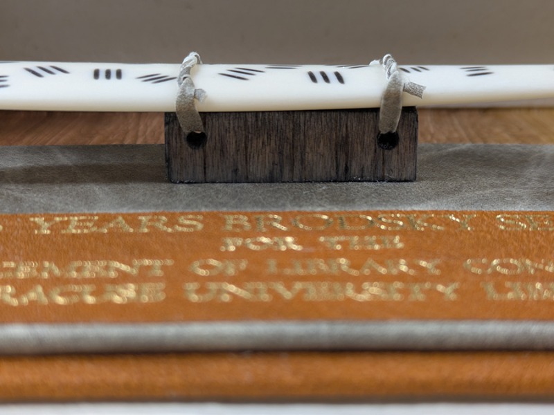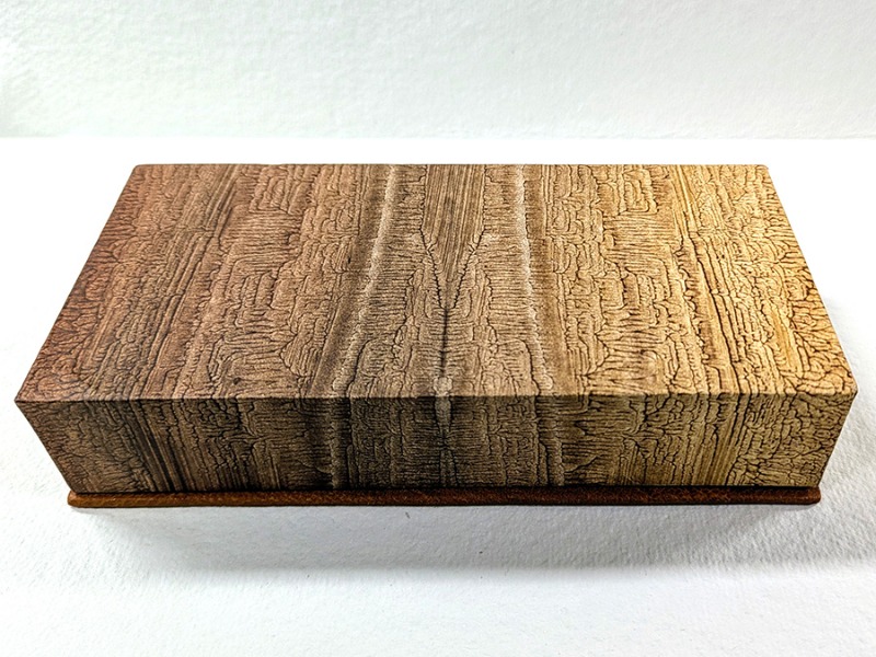 Deckel mit Kleisterpapier bezogen, unten Leder (orange) und Pergament (grau). Falzbein so von Shanna Leino Erworben,