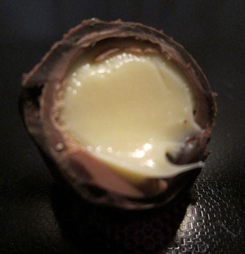 Praline mit Orangenlikör drin - Kern ist flüssig wie z.B. bei Weinbrandbohnen aus dem Geschäft