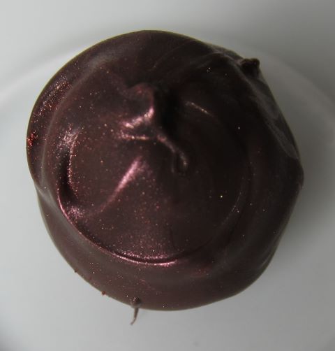 Drin ist übrigens genau das, was im Rezept angegeben war: Hohlkörper, weiße Schokolade, Sahne, Glukosesirup, Butter, Orangenextrakt. Dann noch die Zartbitterschoki und ein wenig Glanzpulver aus der Backabteilung.