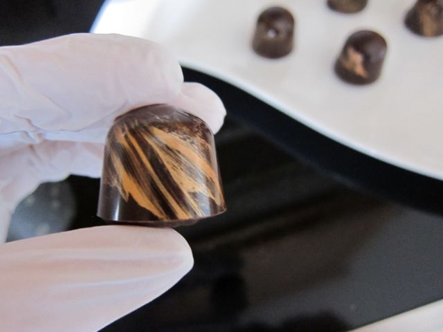 Das war eine Polycarbonatform. Die Hülle besteht aus Zartbitter und die Füllung ist eine Nuss-Nougatmasse nache einem Rezept aus dem Internet.