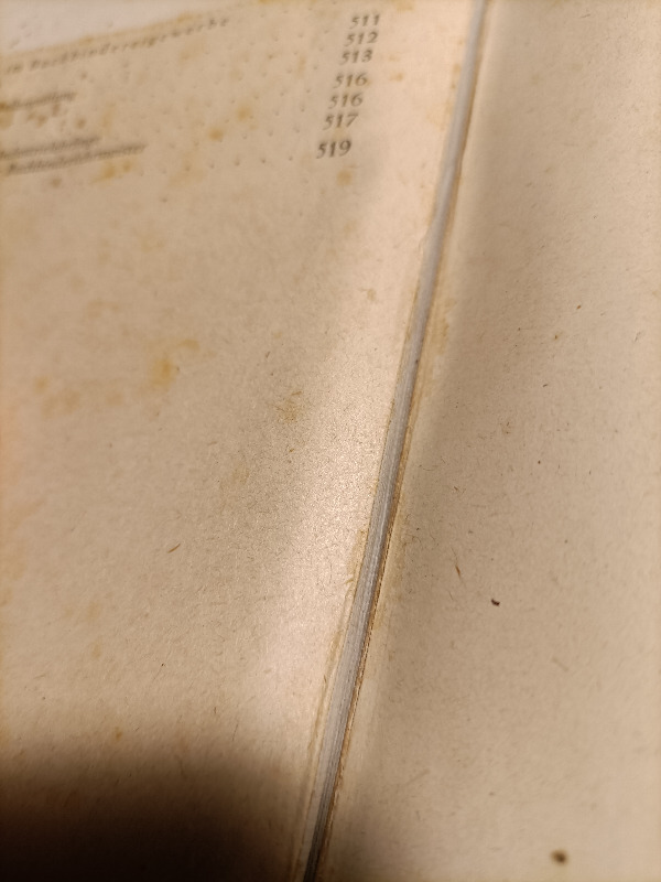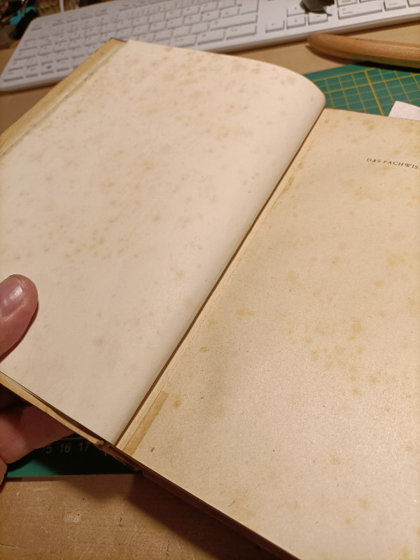 Nope, das ist nicht geflickt, da steht wohl was drunter, was den Besatzungsmächten nicht gefallen hat. Gibt mehrere Stellen, hauptsächlich Abbildungen mit dem wohl auch in der Buchbinderei üblichen "Zierde" des Hakenkreuzes. (hab eins vorsichtig angehoben...)