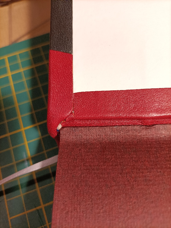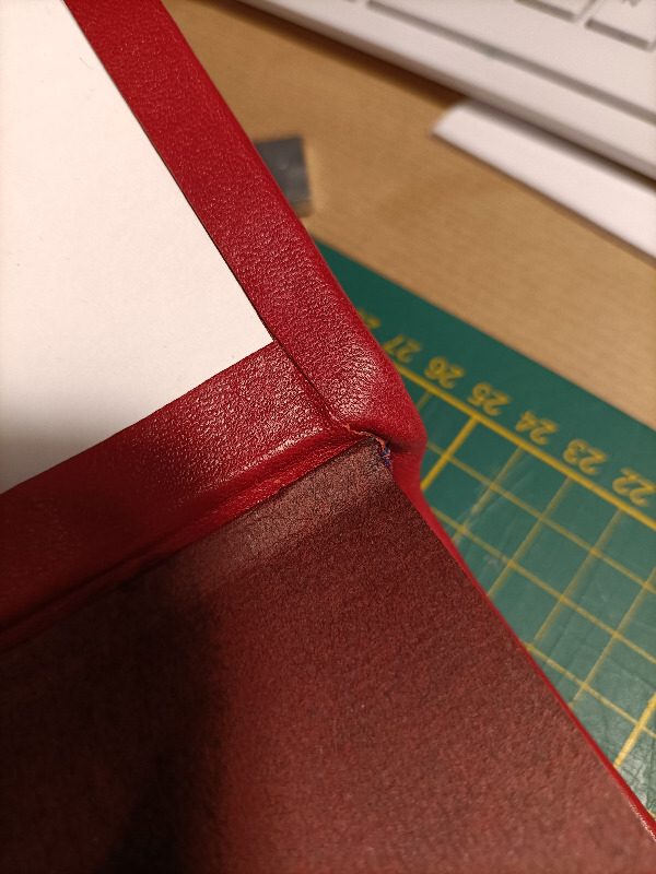 Dabei stört mich jetzt das selbstgestochene Kaptal, bzw, die innere Ecke. Mittlerweile weiß ich schon gar nicht mehr, wie ich den Kopf richtig einschlagen soll. Schneide ich Material ab, hält es nicht mehr und das Problem im Falz ist noch größer.